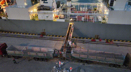 在山東港口青島港前灣集裝箱碼頭,3000余頭活牛卸船轉(zhuǎn)運(yùn)。開(kāi)辟貴賓“牛牛牛”專(zhuān)用通道,針對(duì)活牛接卸特點(diǎn)為客戶(hù)“量身定制”活牛海運(yùn)卸船專(zhuān)屬作業(yè)方案,采用“車(chē)船直取”作業(yè)模式,在碼頭前沿設(shè)置隔離區(qū)域配套設(shè)計(jì)專(zhuān)門(mén)的卸牛平臺(tái)。采取全封閉管理模式等措施,高標(biāo)準(zhǔn)做好活牛卸船裝車(chē)疏港等環(huán)節(jié)的銜接順暢,助推進(jìn)口活牛順利完成卸船作業(yè)。